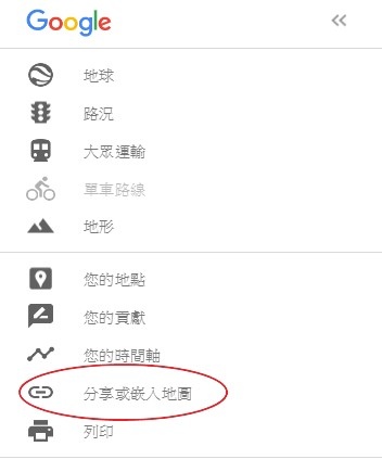 2. 按了選單圖示之後,會下拉出選單列表,再按一下列表中的「分享或嵌入地圖」。