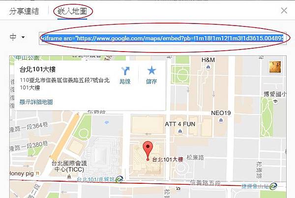 3. 出現地點視窗後點選上方的「嵌入地圖」,然後把下方出現的那一行代碼複製起來,貼到網頁上適當的位置就行了。