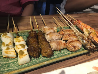 第四道菜上的是海陸綜合串燒,一共有10串;因為不知道要點甚麼,所以乾脆全部都來一點。基本上該有的都有,海鮮的部分有蝦子花枝和喜相逢,肉的部分有咖哩牛肉、泡菜豬肉等等。