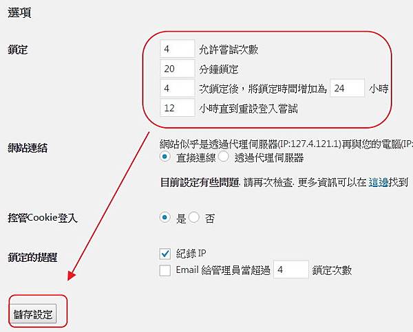 5. 在設定頁面這邊設定你想要的限制Wordpress登入錯誤次數,最後按下「儲存設定」就生效了。