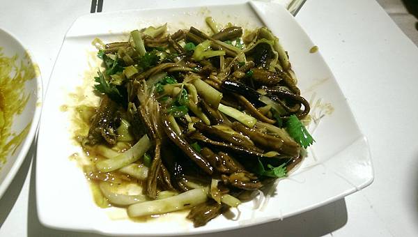 ↓韭黃鱔糊。鱔魚切得很細,很好入口,吃起來有點燒焦的味道,口味偏重,很下飯的一道菜。