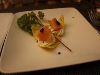 ↓前菜(底下是玉米片,中間有起司奶油,最上層是醃醺鮭魚)