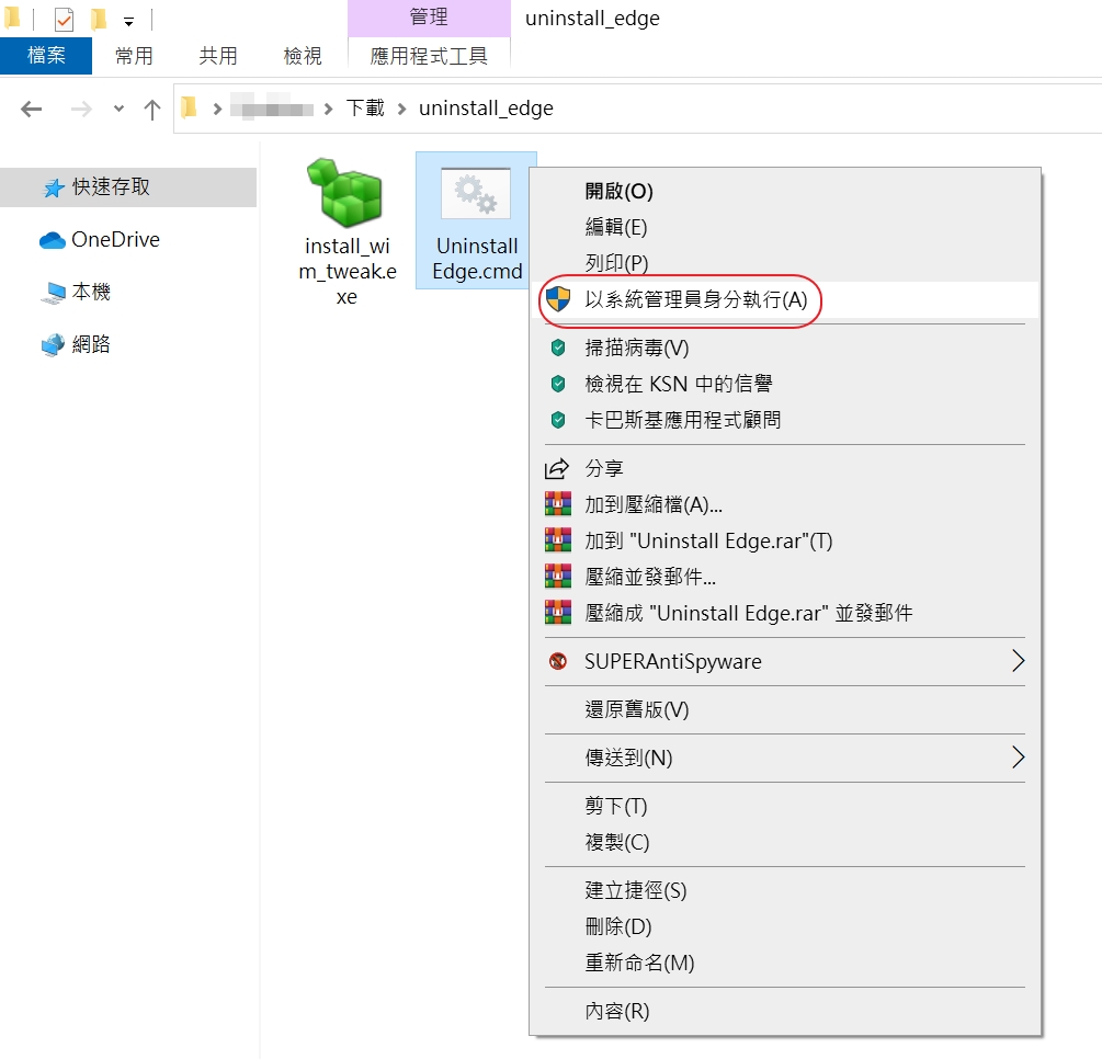 3. 下載回來的是一個壓縮檔「uninstall_edge.zip」,解壓縮之後在「Uninstall Edge.cmd」檔案上按一下滑鼠右鍵,然後點選下拉選單中的「以系統管理員身分執行」。