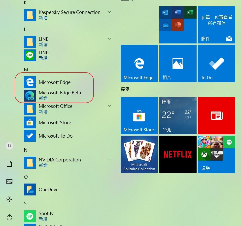 1. 因為安裝了Chromium核心的Edge,所以在Windows 10的開始功能表中可以看到兩個Edge瀏覽器並存。