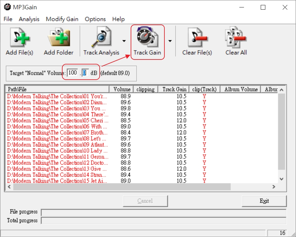 3. 載入完成後,可以在「Target “Normal” Volume」調整音量大小;預設是89dB,但我習慣輸入100dB。最後按下「Track Gain」就開始調整與統一MP3音量大小了。
