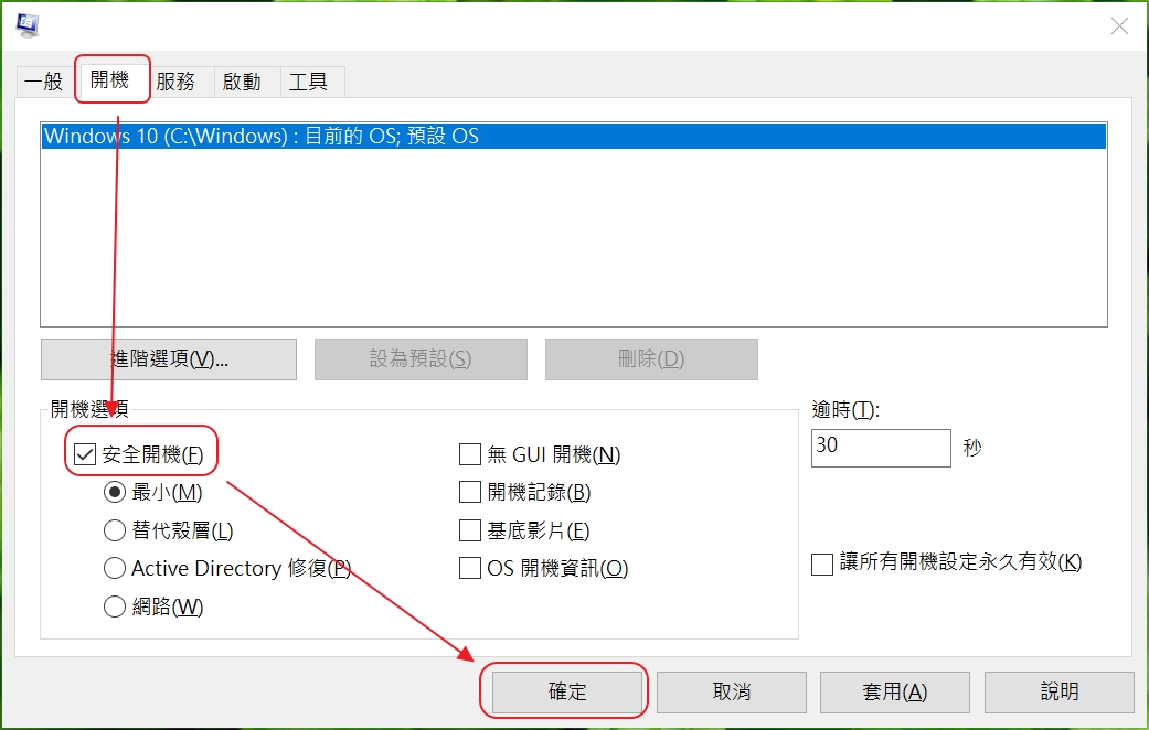 2. System Configuration視窗出現後切換到「開機」標籤,接著勾選開啟選項裡的「安全開機」,然後按下「確定」。