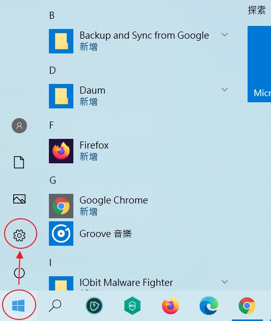 1. 按一下Windows 10左下角的「開始」,然後在開始功能表中按一下齒輪圖示的「設定」。(Windows 11則是在「開始」按一下滑鼠右鍵後點選「設定」)