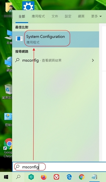 1. 按一下下方工作列上的搜尋框然後輸入「msconfig」,接著點選出現的「System Configuration」應用程式。