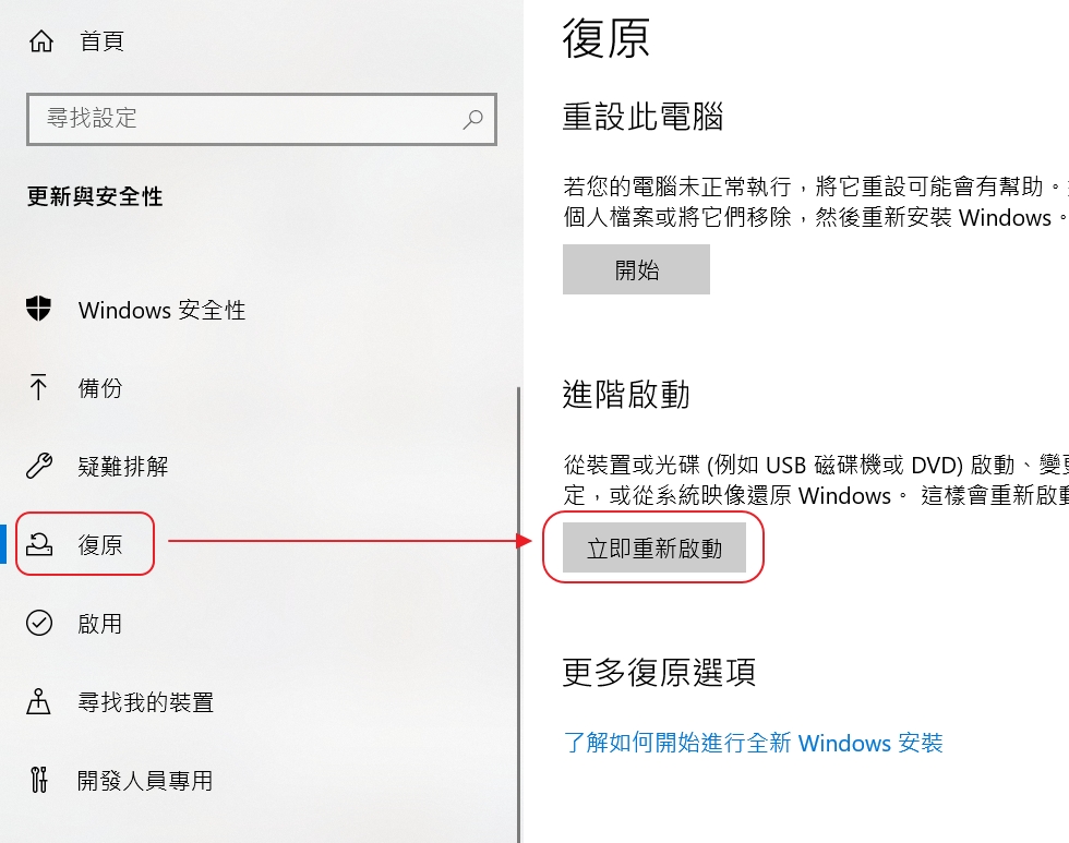 3. 先按一下左邊的「復原」,再按一下「進階啟動」下方的「立即重新啟動」。