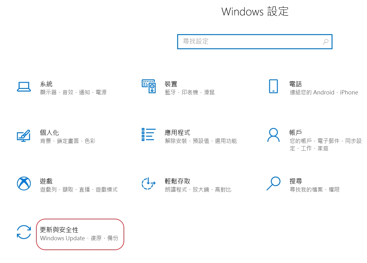 2. 在「Windows設定」頁面這裡點選「更新與安全性」這個項目。(Windows 11則是要點選左邊的「Windows Update」項目,再點選「進階選項」)