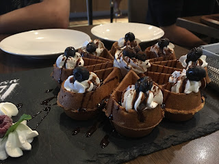鬆餅的外皮烤得很酥,咬下去有餅乾的脆度,但裡面卻還能保有一定Q度,再加上中間的部分是麻吉,整體吃起來很更彈牙。而且鬆餅上的鮮奶油跟藍莓都很對味,淋上巧克力醬更是絕配。我只吃了一片,其他的被我老婆搶光,就能想像好吃的程度了!