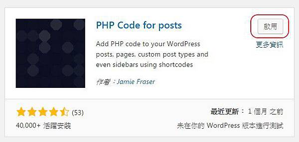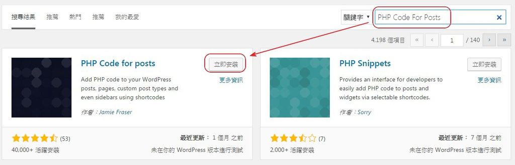 2. 當外掛搜尋框出現之後,在關鍵字右邊輸入「PHP Code For Posts」,當列表上出現PHP Code For Posts時,按一下「立即安裝」。