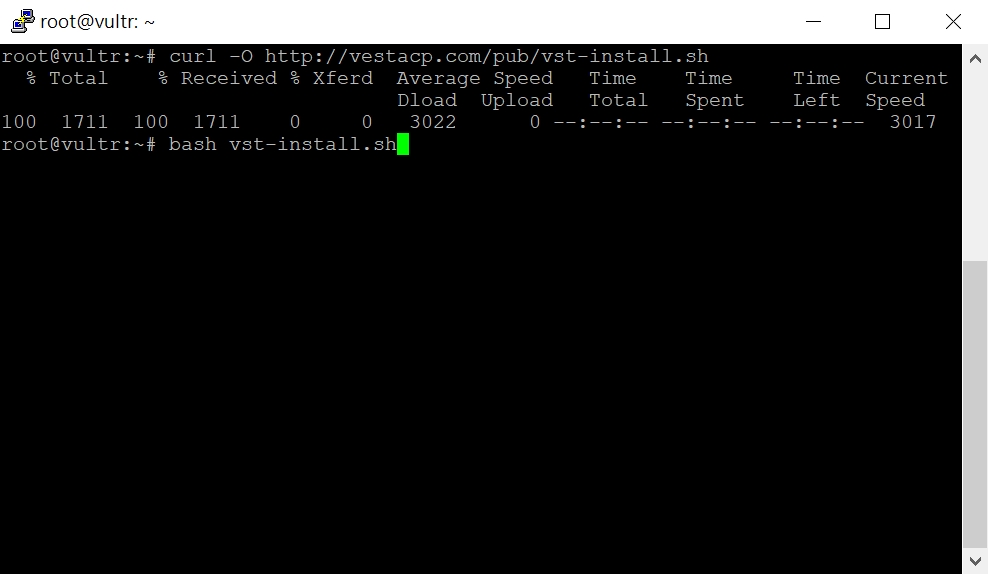 1. SSH連線到VPS主機之後,輸入「curl -O http://vestacp.com/pub/vst-install.sh」然後按鍵盤上的「Enter」(這一行是下載指令)。