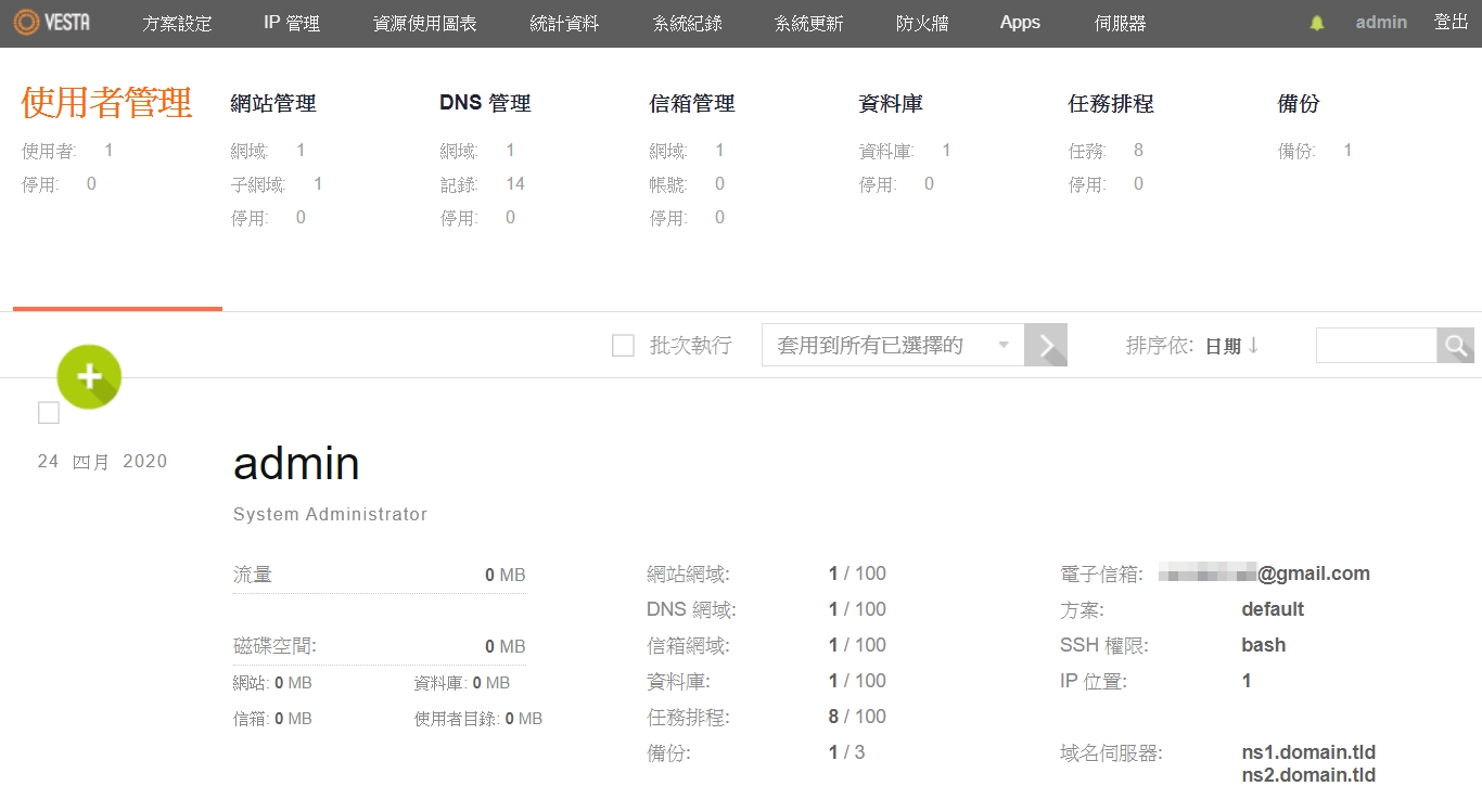 4. 改成正體中文後,VestaCP所有功能應該一目了然了吧!建議各位有空就多加摸索,等熟悉後再正式建立網站。大叔有空還會再寫一篇「利用Vesta控制面板建立網站並綁定域名」的教學。