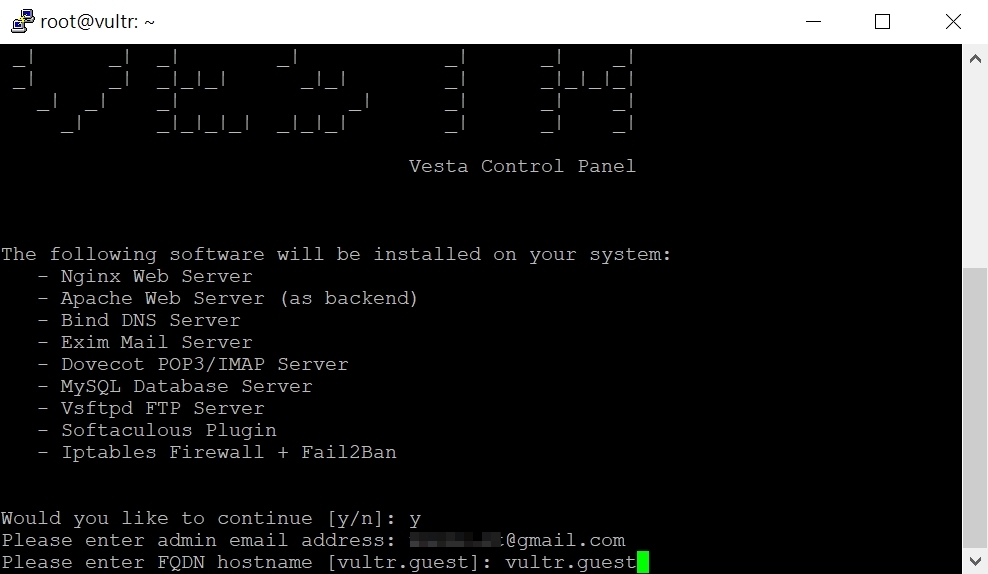 3. 安裝到一半會問你3個問題。第一個是想繼續安裝嗎?當然要按「y」。第二個是要你輸入一個聯絡用的電子信箱。第三個則是要你幫主機取個名稱。回答完之後安裝程序就會繼續進行,需要一點時間,請耐心等候。