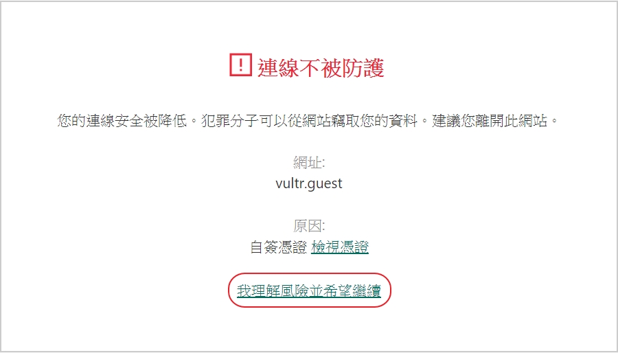 1. VestaCP後台的登入網址,其實就是在主機IP的後面加上「:8083」。比方說,如果VPS主機的IP為「43.224.33.211」,那麼登入頁面網址就是「43.224.33.211:8083」。連進來時若看到這個畫面,直接按一下「我理解風險並希望繼續」。
