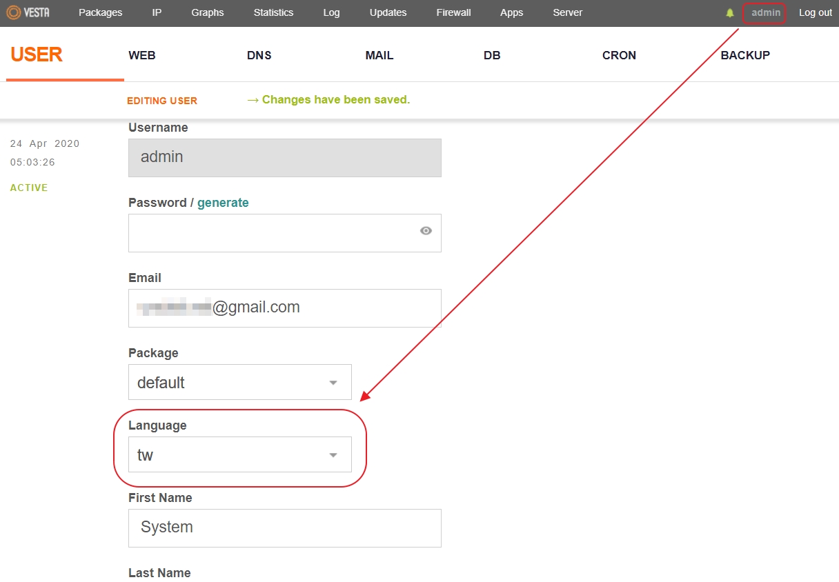 3. 進入後台後先按一下右上方的「admin」,這邊可以把操作介面改成正體中文(tw),也可以修改密碼、聯絡用的電子信箱等資訊;改完後記得按「Save」,其他看不懂的選項建議別亂動。