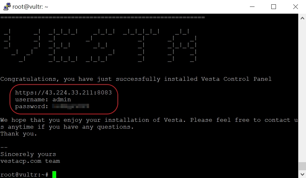 4. 當你看到「Congratulations,…..」並在這句話下面顯示後台的登入網址、username與password,表示VestaCP已安裝完成,這時就可以結束SSH連線了。